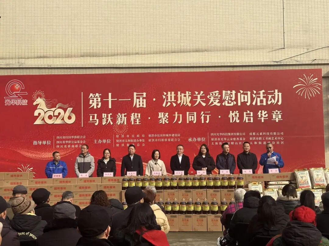 2月10日,四川光华科技集团第十一届“洪城关爱”慰问活动在射洪市职工书画艺术中心温情启幕。本次活动由四川省归国华侨联合会、四川省华侨公益基金会、四川省侨商联合会指导,射洪市民政局、射洪市住房和城乡建设局、射洪市太和街道办事处、射洪市归侨侨眷联合会、射洪慈善总会联合主办,四川光华科技集团有限公司携手成都元素科技有限公司、射洪市光华云朵慈善基金、射洪市职工书画艺术中心、太和街道凉帽山社区及建设社区共同承办。